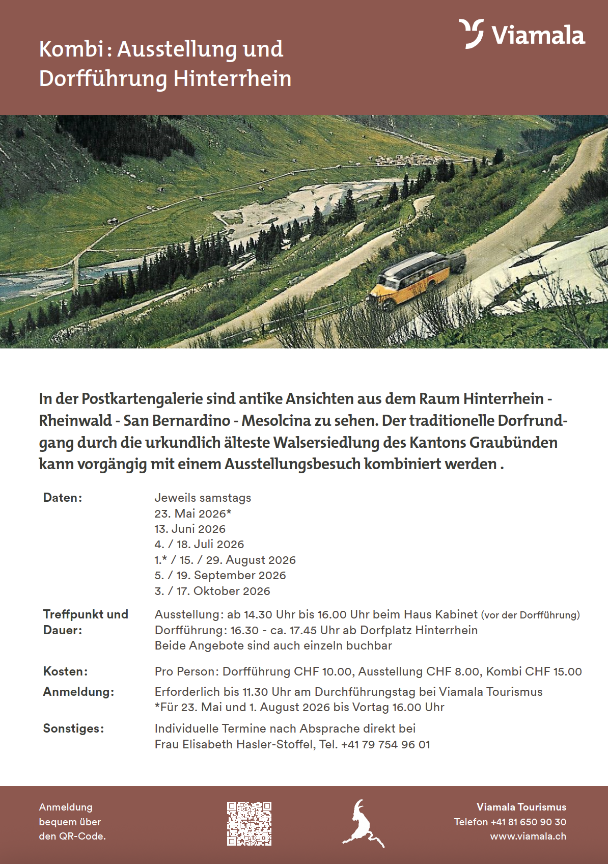Hinterrhein ist ein typisches Passdorf mit „Fenstern“ nach Norden und nach Süden. Von hier gelangt man über den Valserberg nach Vals und weiter ins Lugnez oder über den San Bernardinopass, einer herrlichen Moränenlandschaft, in die benachbarte Mesolcina. Wer es schnell mag, nimmt den Tunnel der A13 unter die Räder und ist im Nu in Locarno oder in Lugano und somit unter südlicher Sonne.